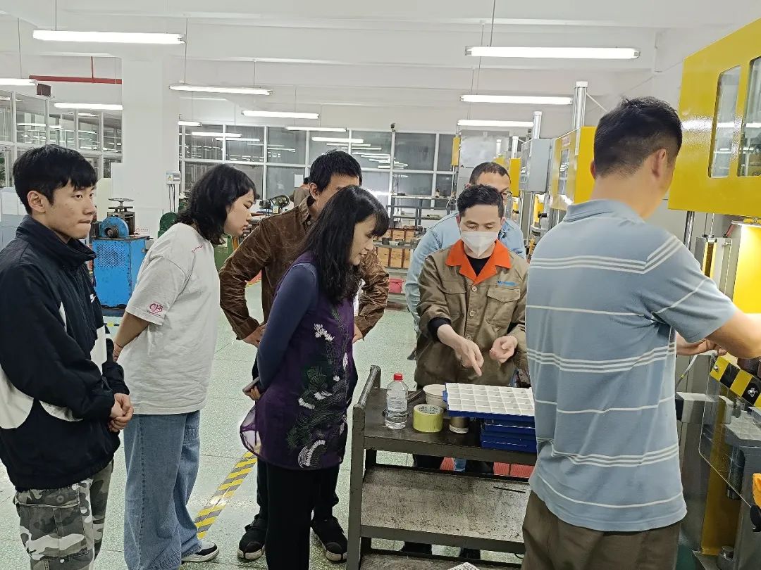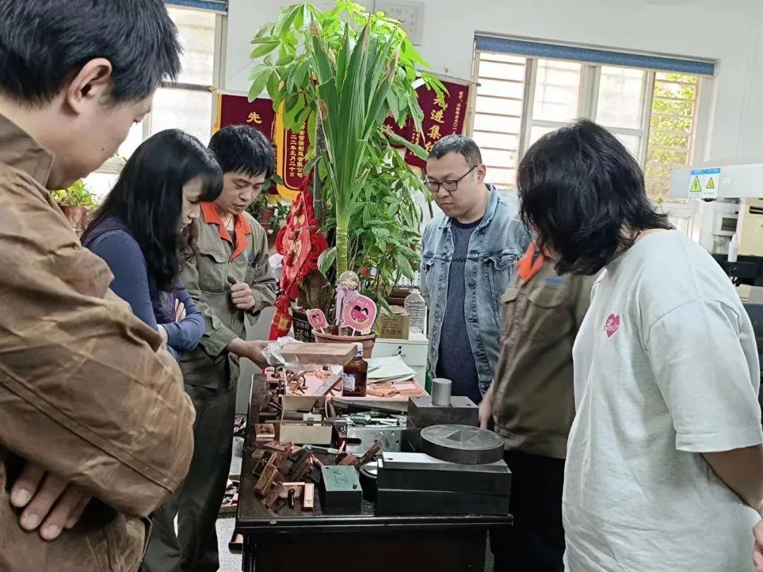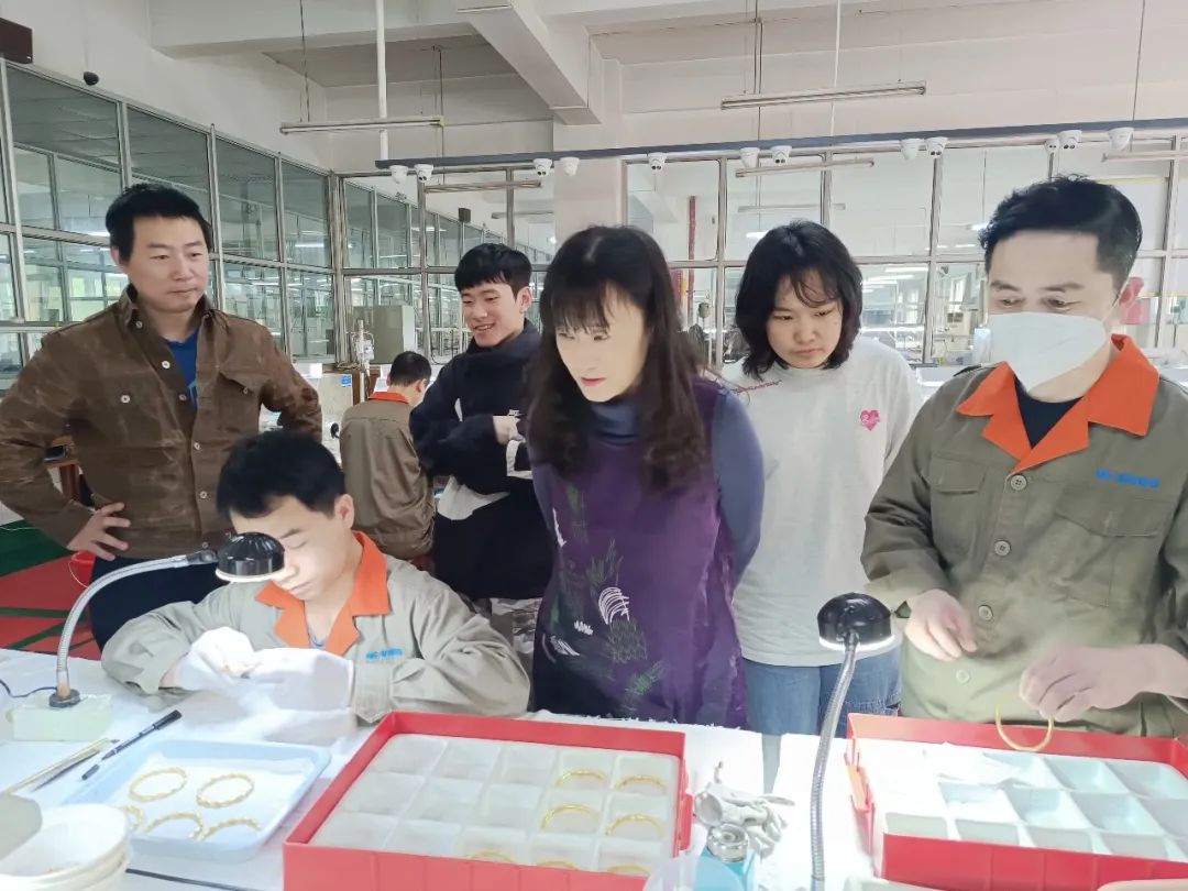 新金珠宝的各位领导和部门负责人邀请公司师生全程参观公司的金货制作流水线并详细介绍工艺流程,解答疑惑。现场考察了参与此次实习安排的员工工位,了解并慰问了员工的工作内容和生活等各类情况。