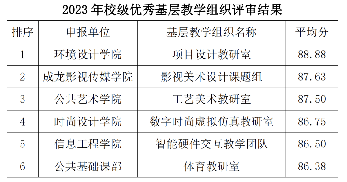 根据《关于开展2023年校级优秀基层教学组织申报工作的通知》(武设院〔2023〕63号),教务处组织开展了校级优秀基层教学组织评审。经项目负责人申报、单位推荐、教务处初审、专家评审,现将评审结果予以公示(评审结果见附件)。根据文件精神,评审结果排名前6的基层教学组织,被认定为2023年校级优秀基层教学组织;省级优秀基层教学组织申报将从2022年、2023年校级优秀基层教学组织中择优推荐。