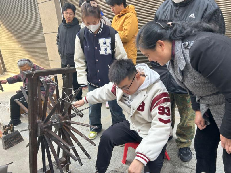 参观完非遗博物馆,钟老师带领同学们体验红安大布的纺织技艺,并示范了红安大布纺织技艺中的每道工序及在操作中应注意的问题,钟老师强调想要练习好每一个步骤需要手脚并用,掌握相应的方法和力度。同学们在老师的指导下完成了纺纱、倒筒、织布等步骤的学习和体验。