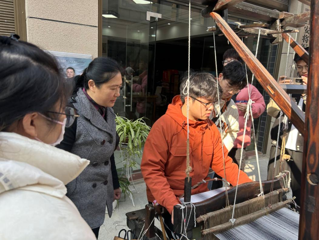 非遗传承人钟先梅老师指导员工织布。