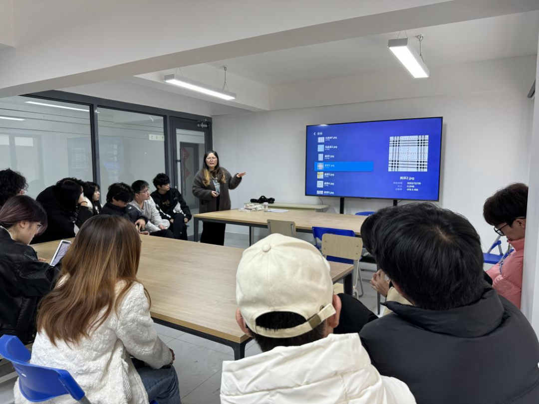 考察期间,师生一同前往拜访了红安大布传统纺织技艺非遗传承中心传承人钟先梅老师,并在她的带领下,参观了民间非遗博物馆。钟老师向同学们展示了织布机器以及手工织品。制作红安大布共有大大小小72道生产工序,钟老师详细讲解了织布的流程,包括纺纱、挽纱、染纱、倒筒、牵经、穿纵、穿扣等。