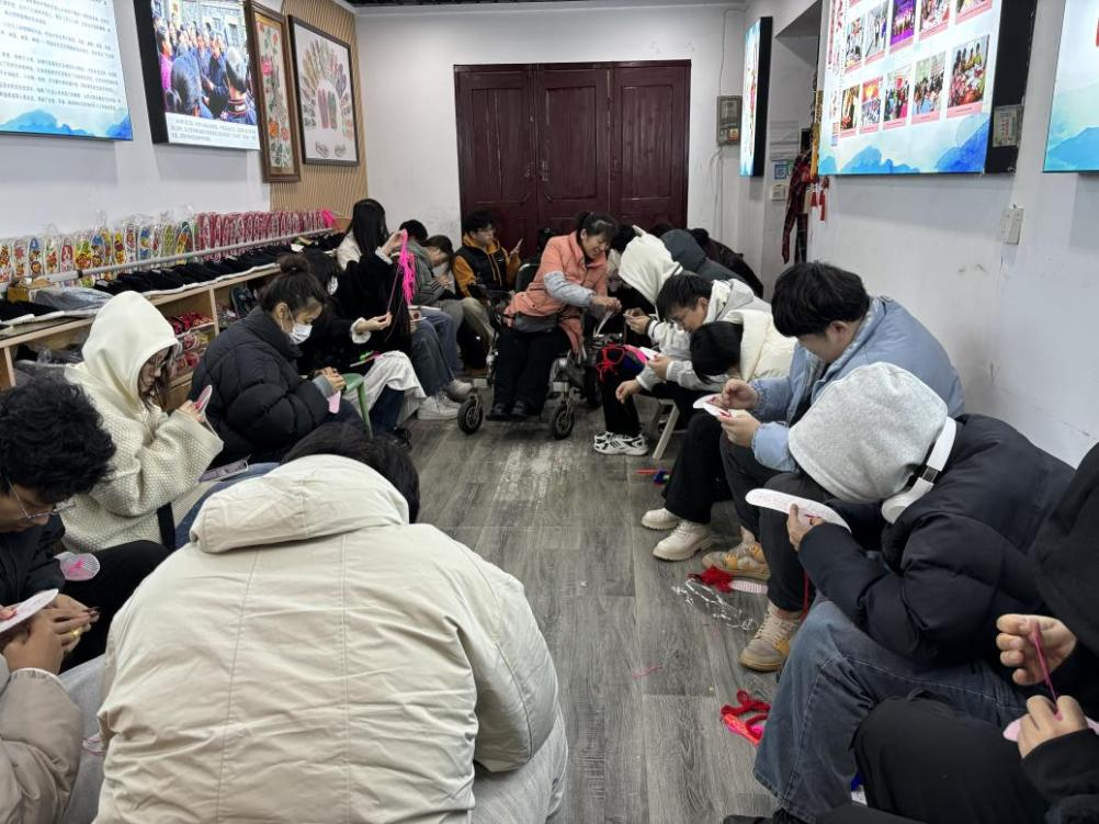 而在红安县七里坪镇长胜街上的红安绣活传习所里,农家布鞋、绣花鞋垫和各式各样的挂件展现着红安绣活的新光彩。绣活传承人席老师手拿针线,不一会儿一个栩栩如生的图案就在鞋垫上诞生了。同学们围着席老师认真观摩,探索一针一线下的奥秘。绣活工艺涵盖丝绣、挑绣、绒绣三大类,并融入当地“红安大布”传统纺织技艺中的提花、印花、纳花等工艺。一双小小的鞋垫,包含多种针法,同学们在学习的过程中连连称赞中国民间艺术的博大精深。