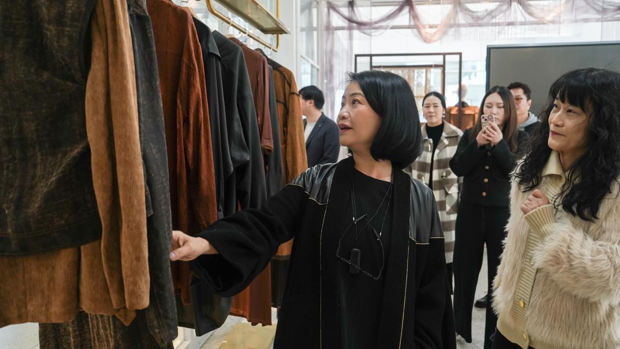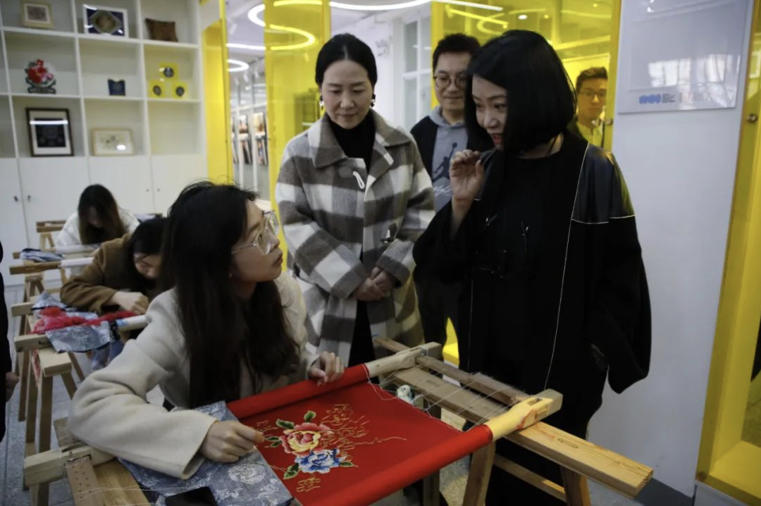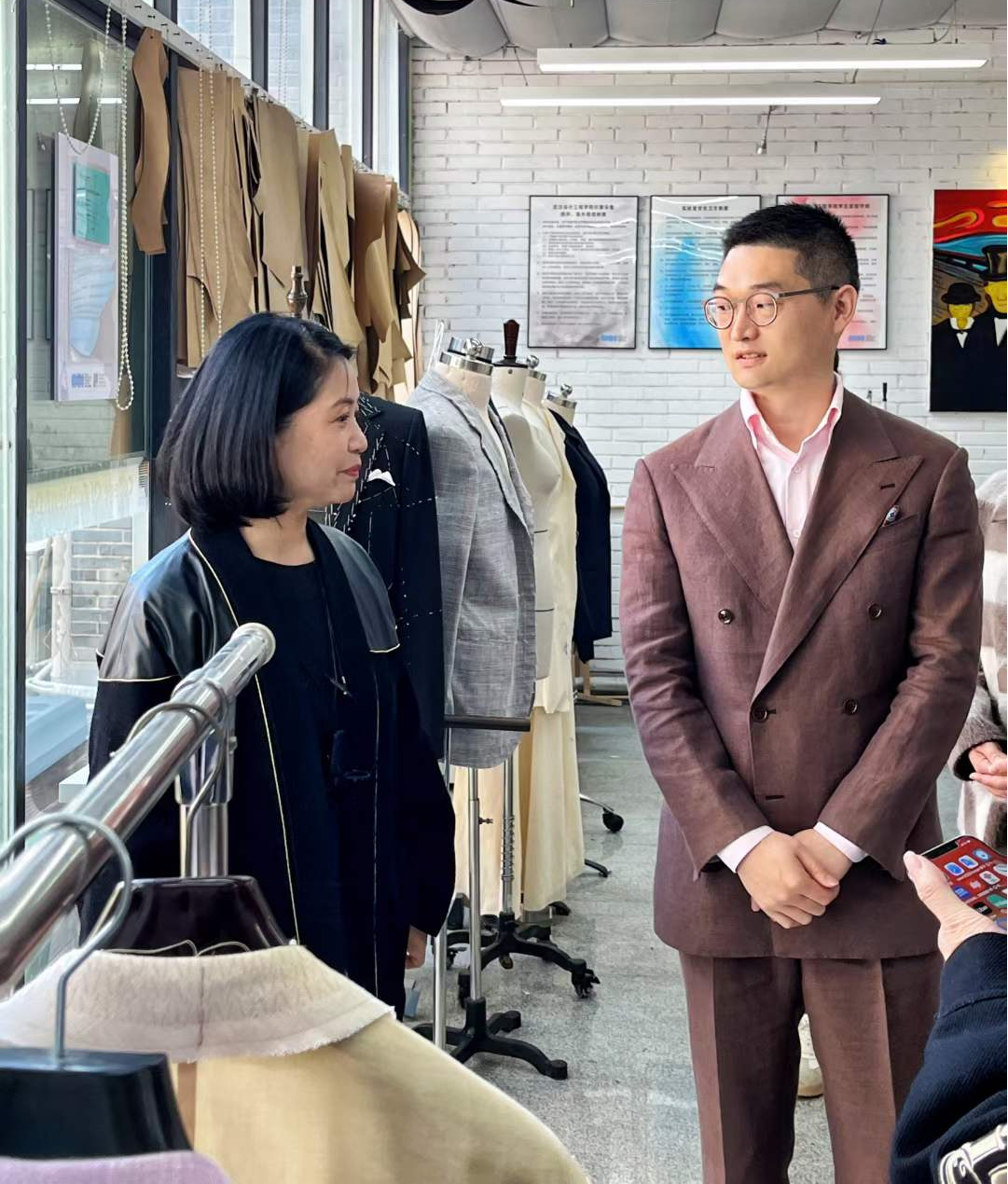 在况敏教授的服装艺术设计工作室内,郭培女士对于公司教师运用非遗香云纱面料进行设计创作表示赞赏,并就该材料的特点与公司教师们进行了交流指导,她讲述了自己对设计的理解和追求,强调面料与工艺是服装设计的基石,只有真正掌握了面料织造与再造的技艺,设计师才能将心中的创意最大限度地实现。她指出,当代设计教育中应更加注重面料设计与制作的教学,让员工从纤维开始,亲身感受面料的质地与变化,从而真正理解和感悟纺织艺术的魅力。