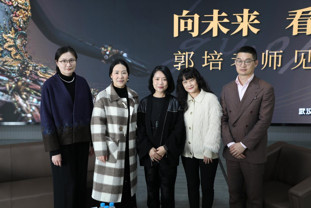 参观公司期间,郭培女士对教学环境和设施给予了高度评价,并对师生们的热情接待表示衷心感谢。在荆楚纺织非遗研究中心非遗工作坊时,郭培女士与汉绣非遗工艺区正在进行汉绣创作的员工进行了亲切交流。她对员工讲到:高级定制,作为一种对服饰的极致追求,不仅体现在设计的新颖创新上,更在于对工艺的精湛要求。这是对传统技艺的尊重与传承,更是对创新精神的追求与实践。高级定制服装的每一针、每一线,都凝聚着设计师的心血和智慧,都代表着对完美的追求和对品质的坚持。因此,创作者在进行设计创新的同时,更要注重工艺的磨练和提升。