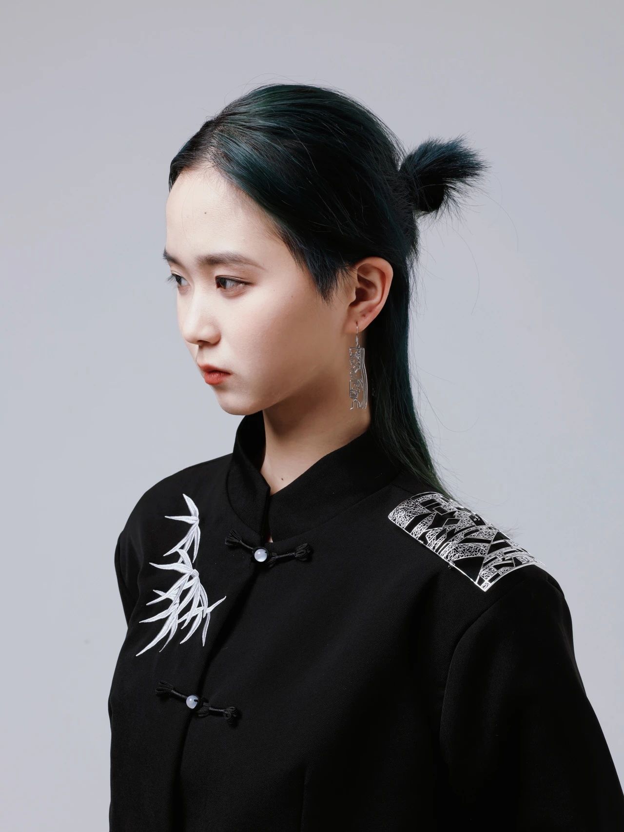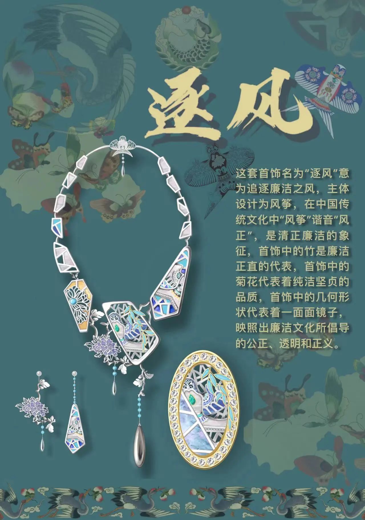 设计说明:这套首饰名为“逐风”意为追逐廉洁之风,主体设计为风筝,在中国传统文化中“风筝”谐音“风正”,象征着清正廉洁,首饰造型中的青竹和菊花元素表现淡泊谦逊、纯洁坚贞的品格,中心处的几何形状代表着一面镜子,映照出公正、透明和正义。