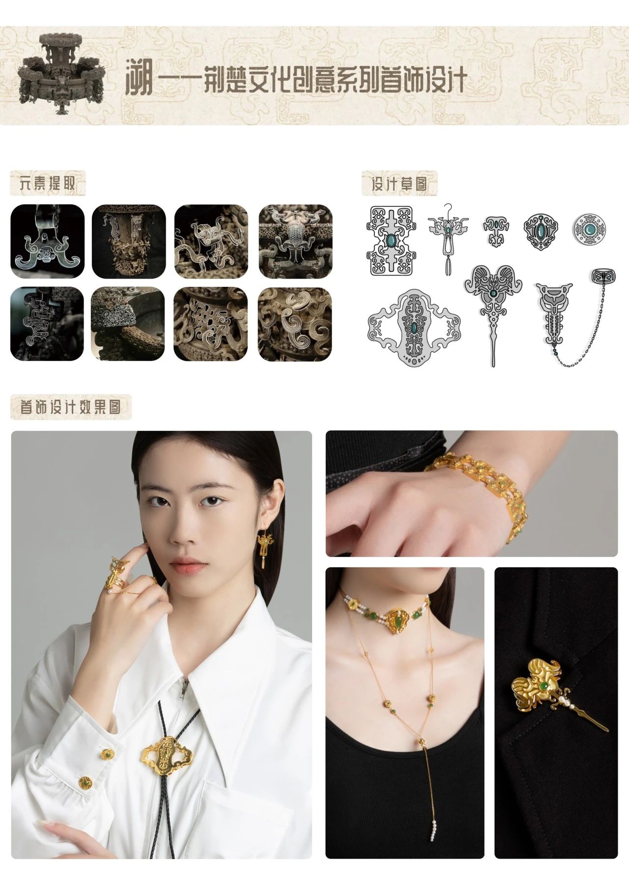 设计说明:本作品以“曾侯乙尊盘”作为切入点,将曾侯乙尊盘上的装饰纹样进行提取分析,总结了纹样的设计风格与造型结构,通过创新再设计,运用于现代首饰设计当中。作品蕴含丰富的文化价值,展现出中华优秀传统文化的鲜活生命力以及青铜器“永恒不变的美”。