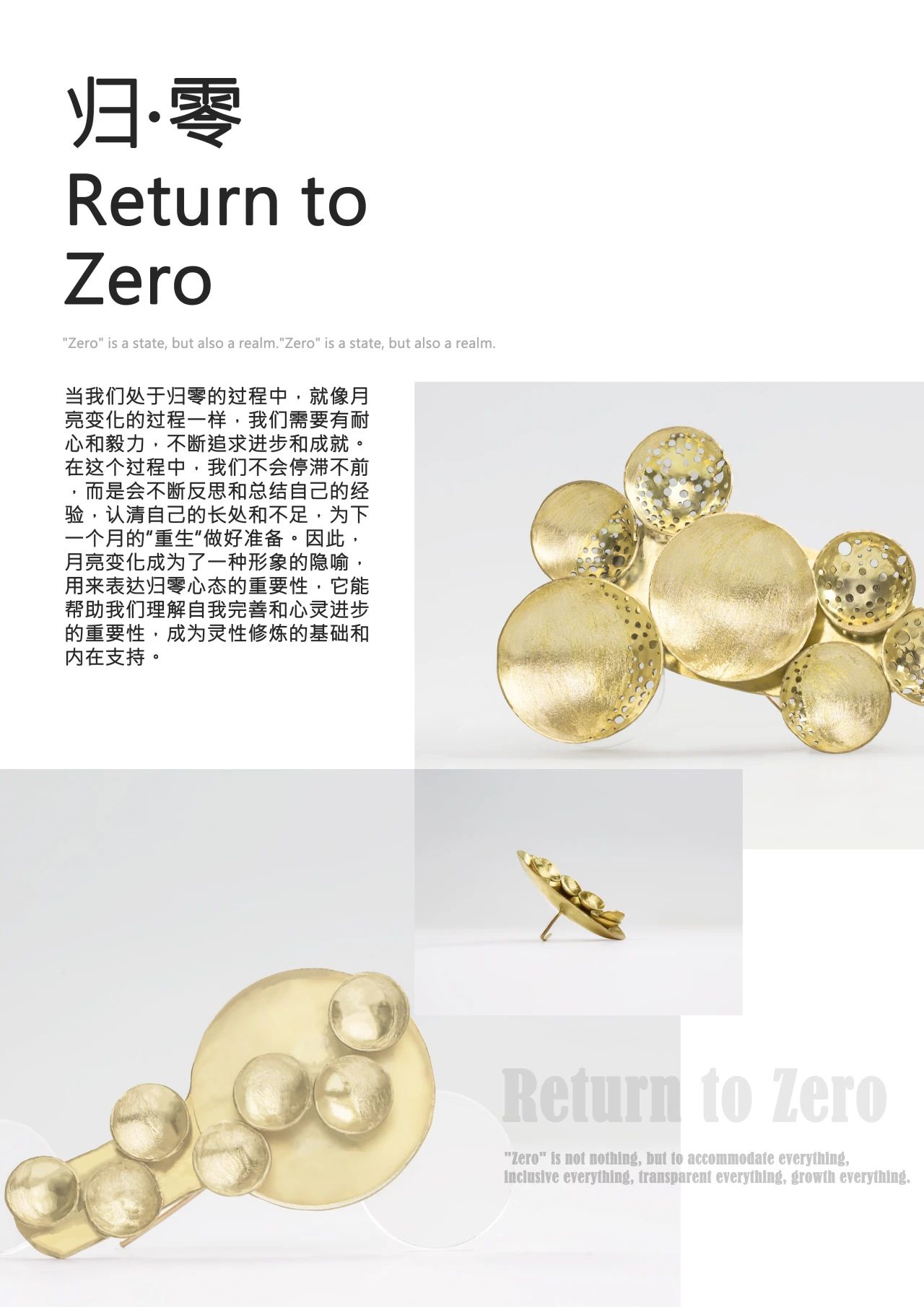 设计说明:当我们处于归零的过程中,就像月亮变化的过程一样,我们需要有耐心和毅力,不断追求进步和成就。在这个过程中,我们不会停滞不前,而是会不断反思和总结经验,认清自己的长处与不足,为下一个月的“重生”做好准备。因此,月亮变化成为了一种形象的隐喻,用来表达归零心态的重要性,它能帮助我们理解自我完善和心灵进步的重要性,成为灵性修炼的基础和内在支持。