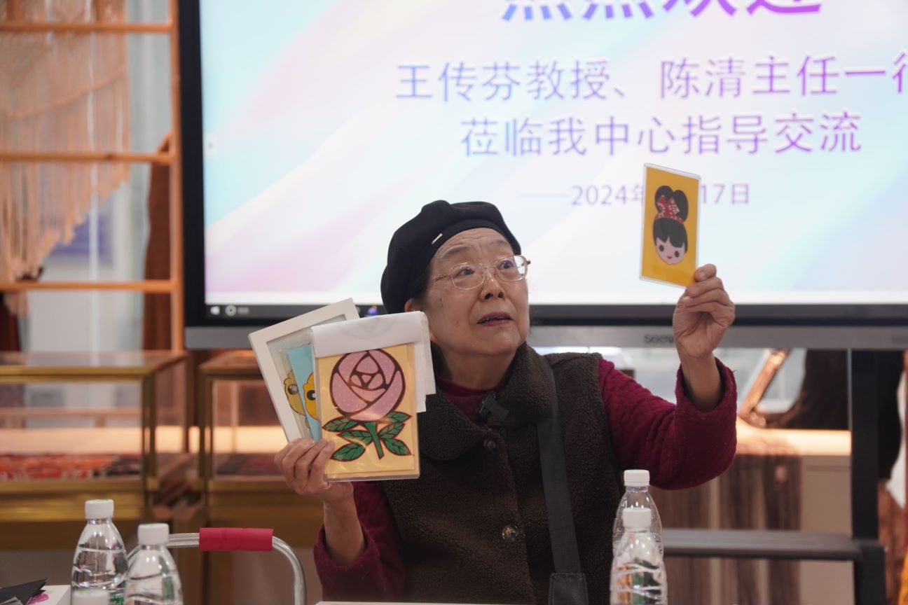 非遗工艺体验活动中,徐拥华副董事长、荆楚纺织非遗研究中心副主任胡舒娟老师与王教授对于非遗的传承、高校在非遗的传承与创新中承担着何种角色等问题进行了深入的交流。