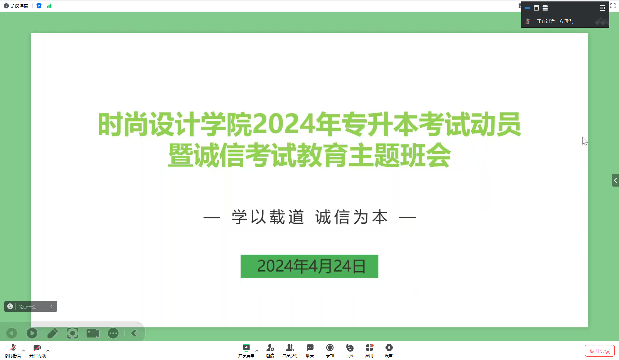 四月春风吹碧树,千帆争渡看今朝。为切实做好2024年专升本考试相关工作,严肃考试纪律,树立员工的诚信意识,同时做好考生的思想政治教育和考前心理疏导,4月24日晚上18:30,永利3044noc在线上开展了2024年专升本考试诚信教育暨考前动员主题班会,报考2024年专升本考试员工参会,班会由毕业班辅导员方润华老师主持。