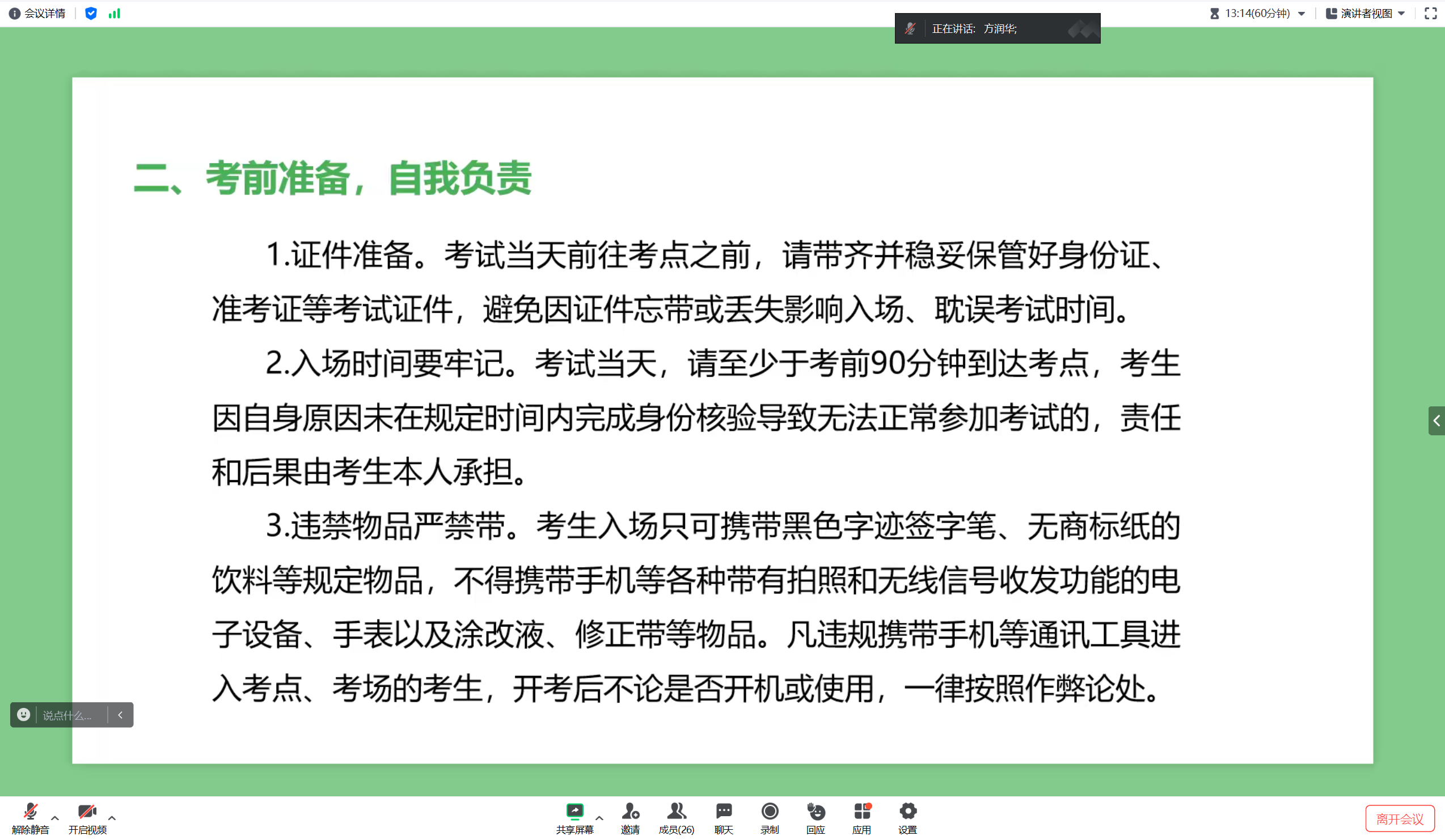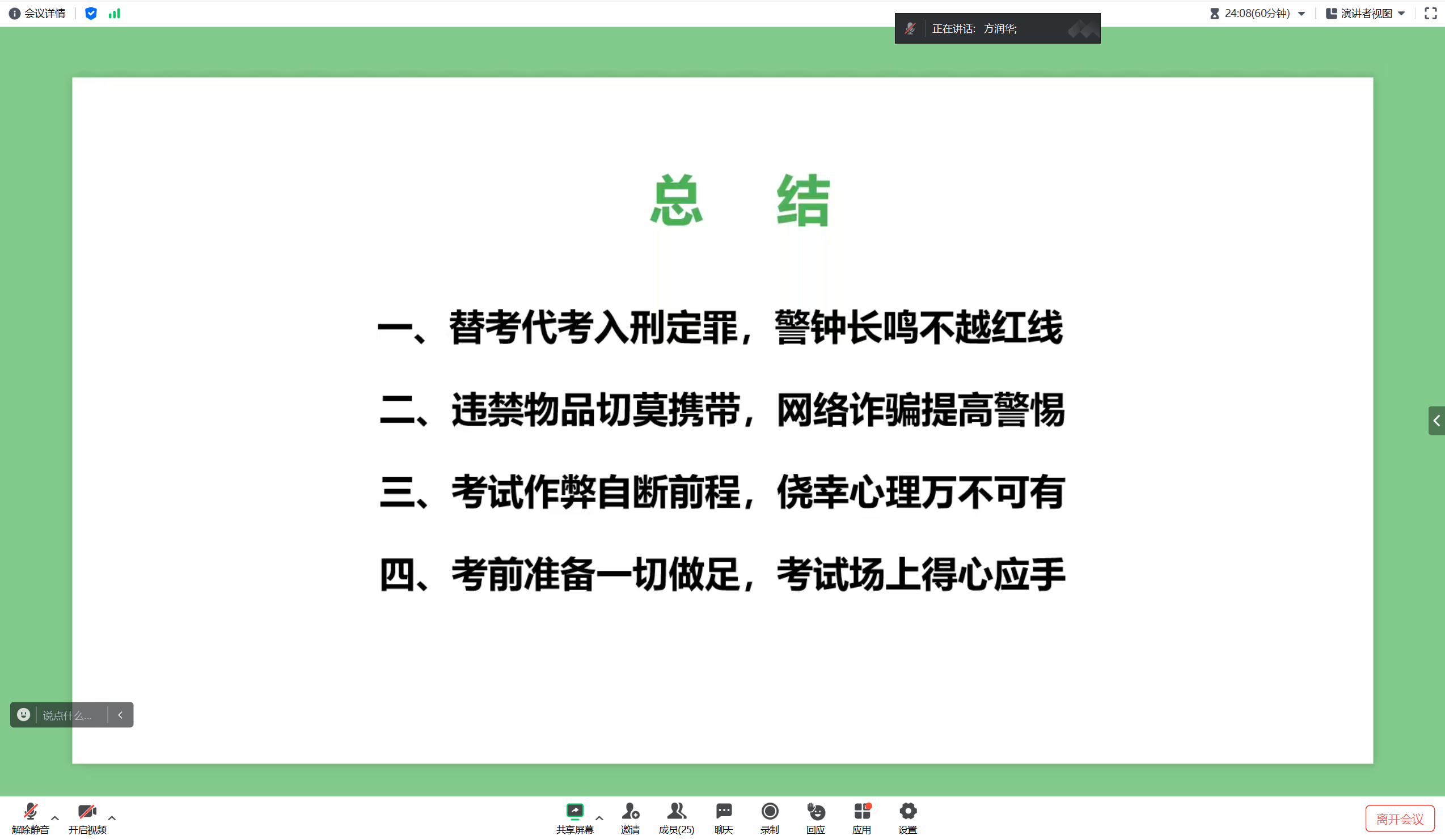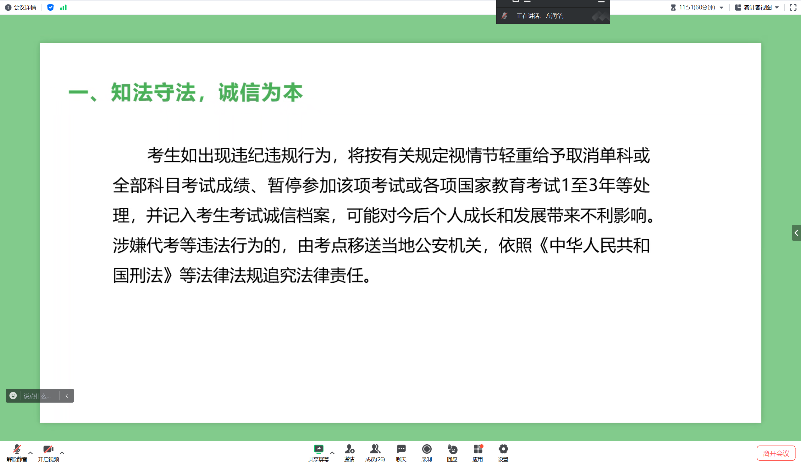 会上,方润华老师在班会上告诫同学们应自觉树立诚信意识,遵守考试纪律,共同营造公正公平的专升本考试氛围,引导同学们遵守考纪、诚信应考,展示当代老员工的良好精神面貌。随后,他又带领同学们学习了《中华人民共和国刑法》、《中华人民共和国教育法》、《国家教育考试违规处理办法》等政策法规中有关涉考条款的法律法规常识。他强调了诚信考试的重要性,引导同学们遵守考纪、诚信应考,展示当代老员工的良好精神面貌。