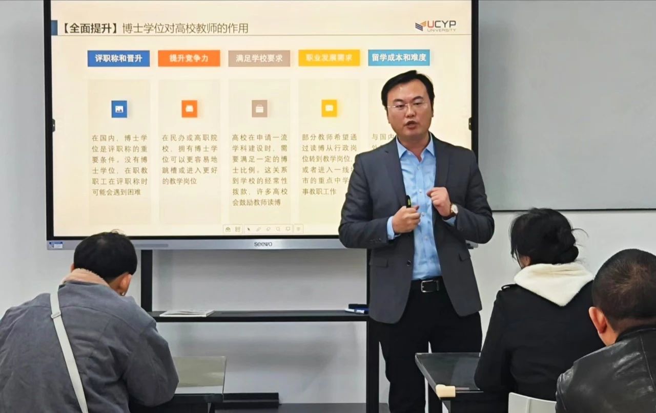 紧接着,马来西亚彭亨教育基金大学中国代表处副主任吕佩林带来了《学历与职业生涯规划———博士留学》的分享。吕博士结合自身海外深造经历,介绍了国际前沿的教学理念与研究动态,鼓励教师们积极寻求深造机会,拓宽学术视野,提升个人专业素养与教学水平。
