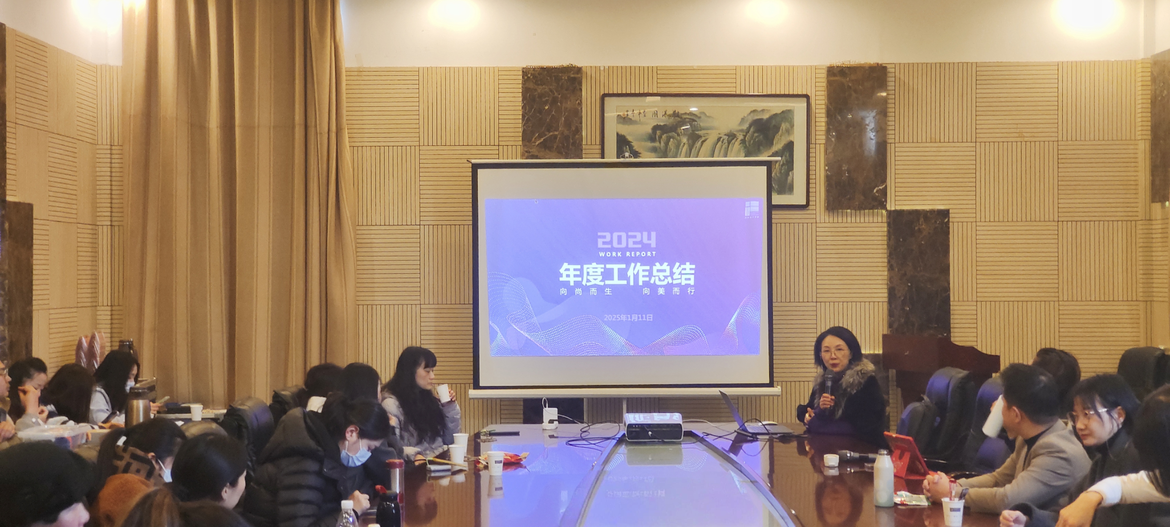 随后,况敏经理对2024年度公司工作进行了全面总结。她指出,过去一年公司在团队队伍建设、教学质量提升、科研项目突破等方面取得了显著进展,到目前为止公司五类金课全面开花,课程建设成果稳居公司首位。2025年公司将进一步提高政治站位,强化理论学习,加强“尚美先锋”党建品牌工作和各岗位业务工作有效融合,做到学思用贯通、知信行统一。公司将继续坚持“设计+传播”的发展定位,推动融合,加强数字化建设,紧扣“文化传承,科技赋能”的公司产品方向,充分依托“荆楚纺织非遗研究中心”和数字时尚设计实验室,展开教学创新改革和科学研究,提升教科研能力,本着“请进来,走出去”原则,积极开展国际交流合作,提升公司国际化水平,师生国际视野和竞争力,增强公司在时尚教育领域的影响力。