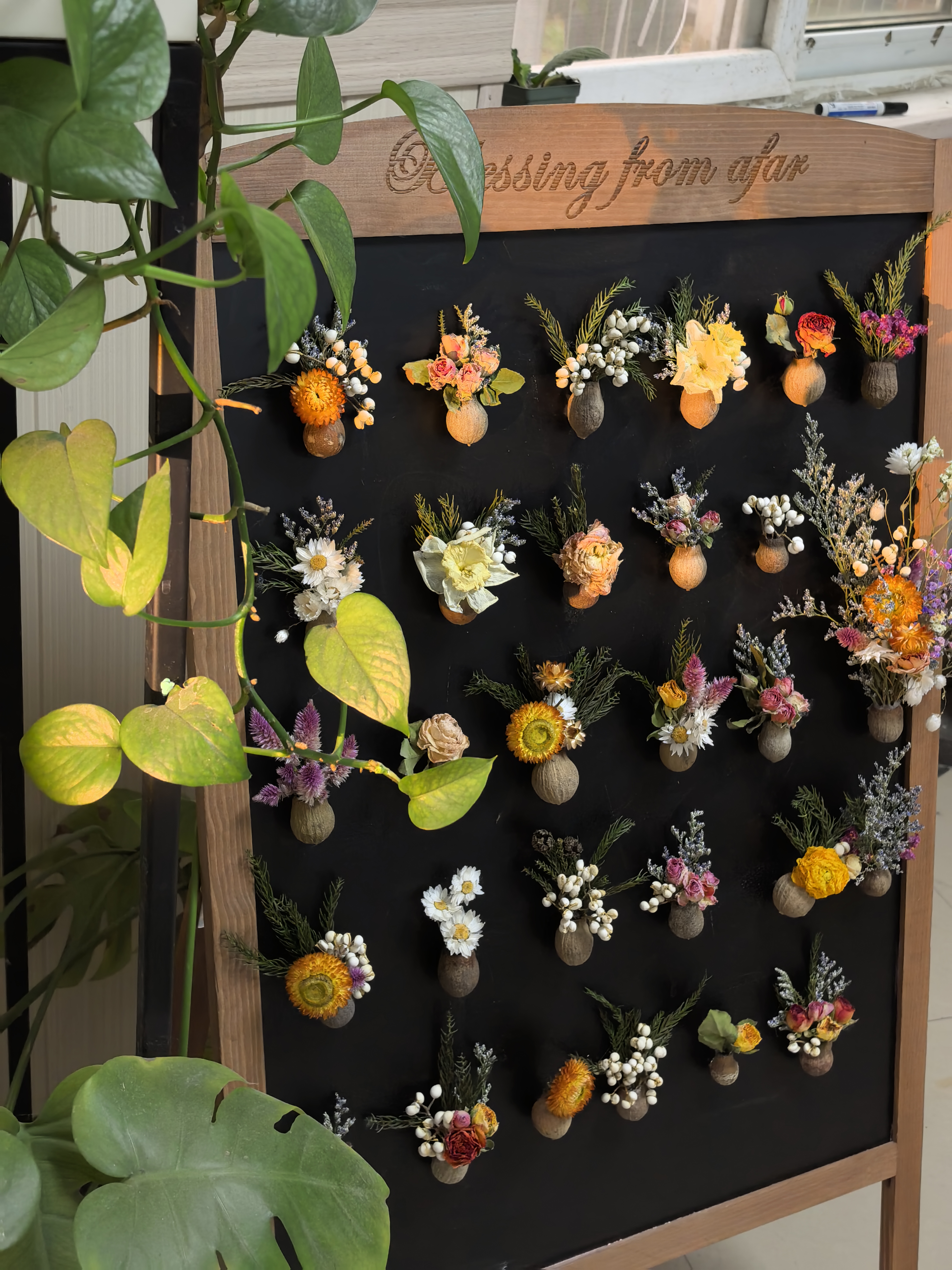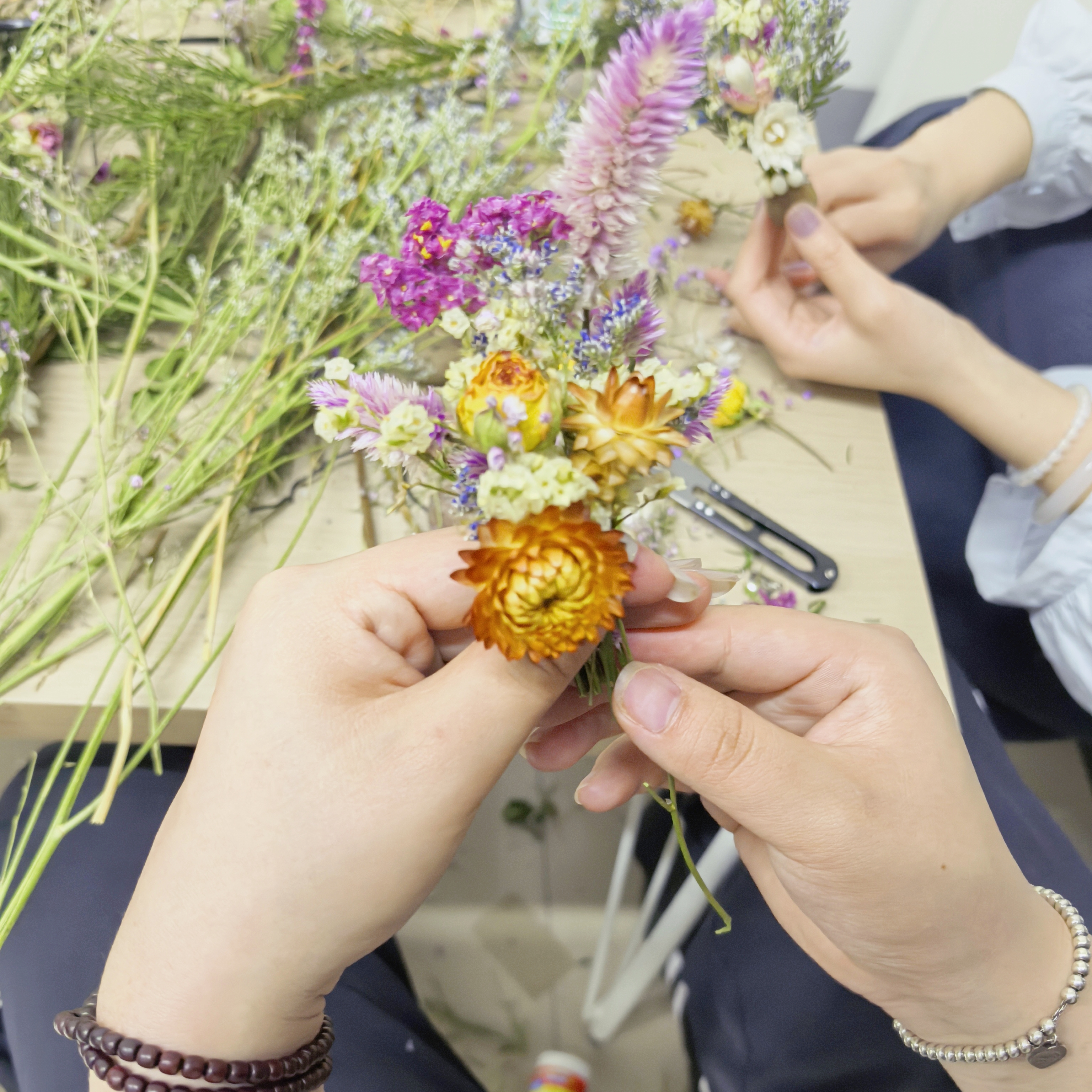 随着时间的推移,一个个独具匠心的花艺作品在同学们的手中诞生。有的以浪漫的粉色系干花为主调,搭配古朴的咕嘟果,带来一丝浪漫气氛;有的用金黄的干花和棕色的咕嘟果,营造出秋日丰收的氛围。这些成品不仅是简单的手工艺品,更是同学们奇思妙想的结晶。