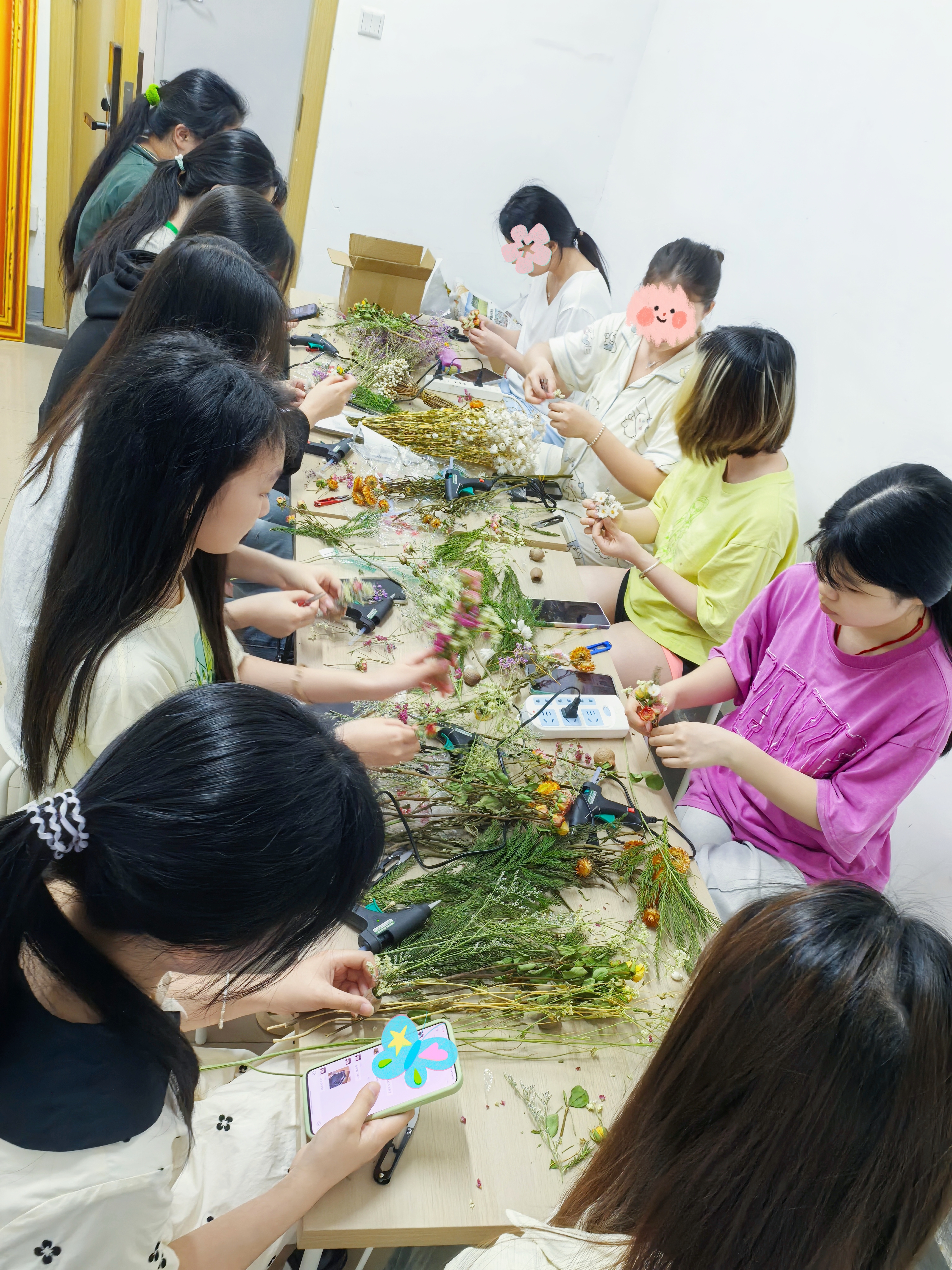 活动现场,五颜六色的干花被精心摆放,仿佛是大自然的调色盘,散发着淡淡的自然香气,沁人心脾。圆润可爱的咕嘟果也排列有序,它们形态各异,有的像小巧的灯笼,有的似精致的铃铛,让人眼前一亮。这些充满生机的材料刚一亮相,就迅速吸引了大批同学。大家迫不及待地围到工作台旁,眼神中满是好奇与兴奋,仿佛已经迫不及待想要开启这场手工创作之旅。