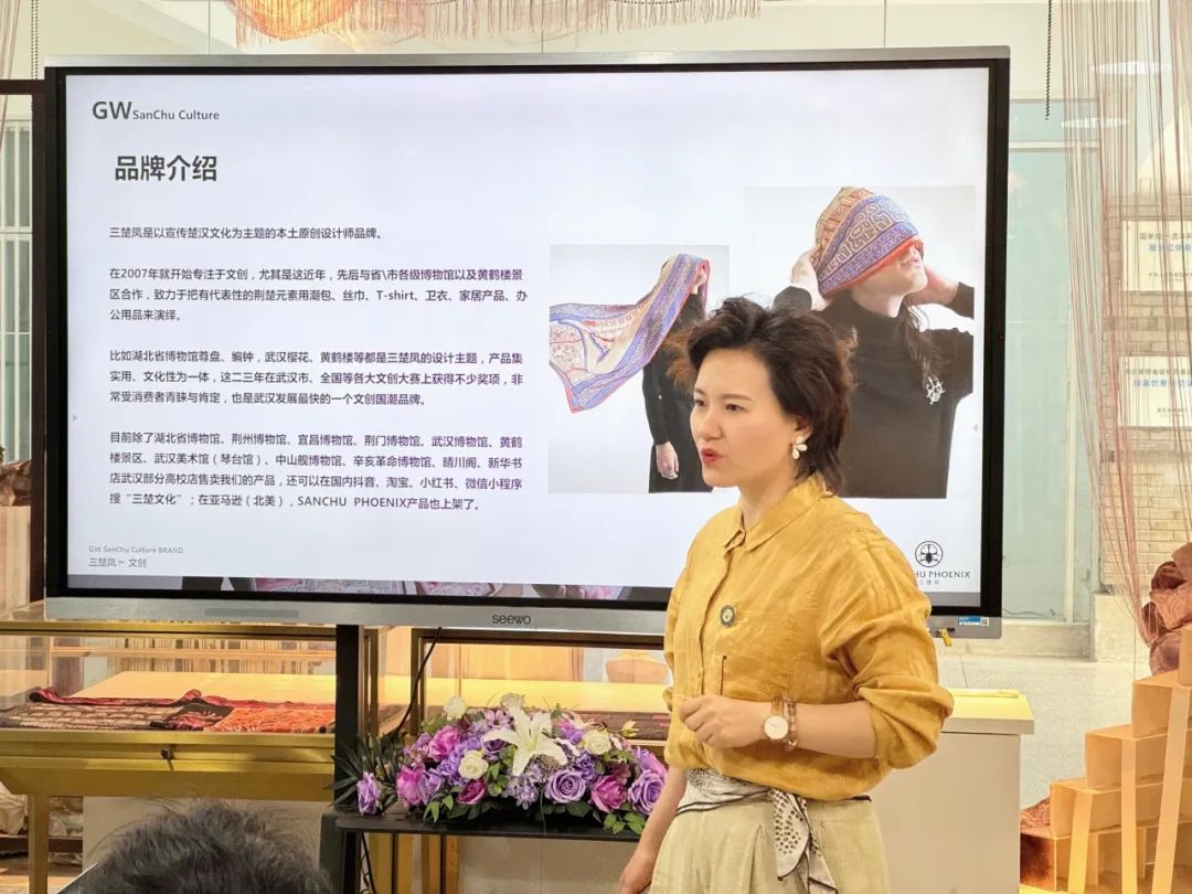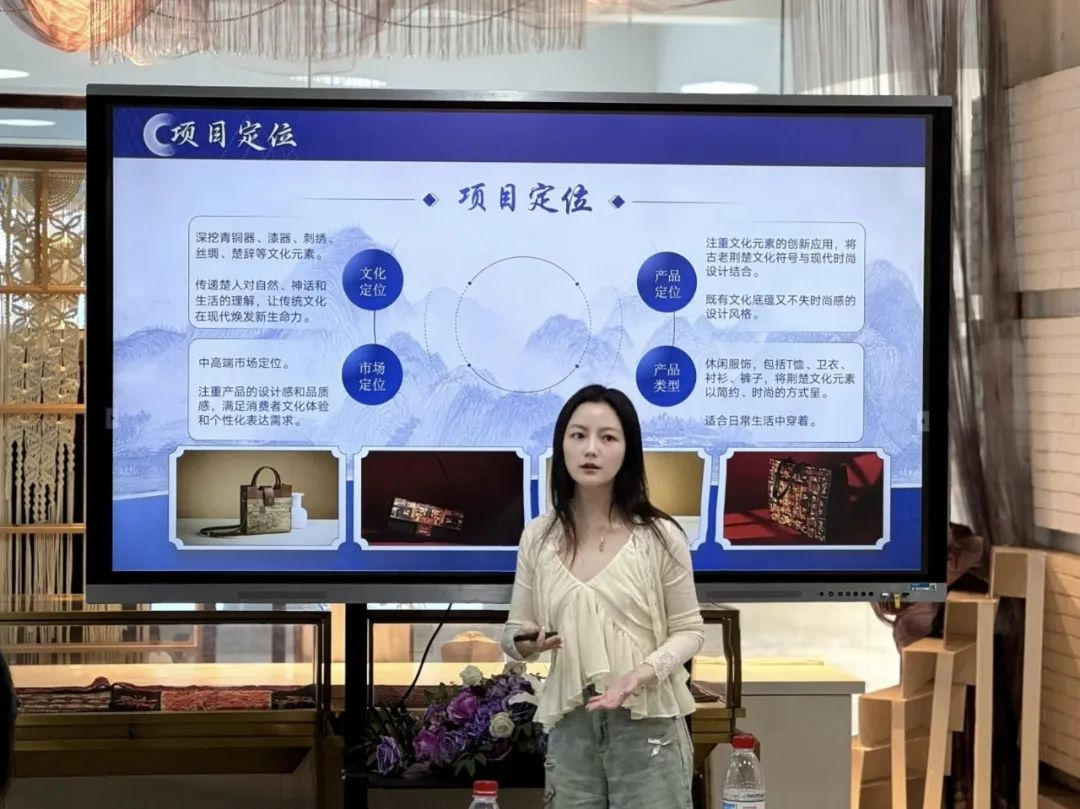 随后,金步摇文创运营总监王凤以“如何将设计和荆楚文化结合?”这一话题开场,从品牌的文化溯源、设计灵感,到产品的市场定位、营销策略等方面详细介绍了三楚凤品牌的基本情况。三楚凤品牌始终秉持对荆楚文化的热爱、坚持文化创新和文化传承,将文化和文物与时尚结合,让创意构思形成产品落地。通过具体的产品展示,让在场的每一位同学对文创产业和三楚凤品牌特性有了深入的了解。