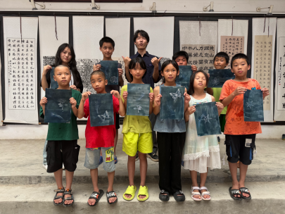 在山间午后的阳光下,孩子们用拾来的树叶、花瓣、剪纸图案进行构图,在铁盐与感光纸的化学反应中,一幅幅蓝白相间的自然画卷缓缓显影。蓝晒不仅是一门传统工艺,更成为孩子们观察自然、记录家园的方式。