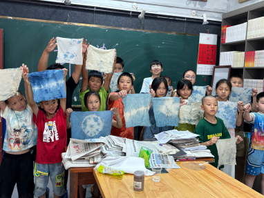 尚美曙光志愿队围绕蓝晒、扎染与84锈迹纹路三项非遗工艺详细制定了“艺术点亮乡村”系列课程,面向当地村民与留守儿童进行教学互动与创作体验。