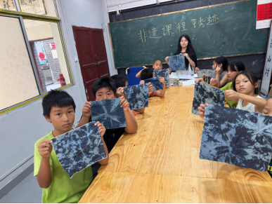 结合当地丰富的植物资源和传统布料,团队带领小朋友们亲手折布、打结、浸染,体验中国传统的扎染技艺。那些色彩斑斓的纹样,不仅映出童真的想象,也承载着对乡土文化的再发现与再创造。
