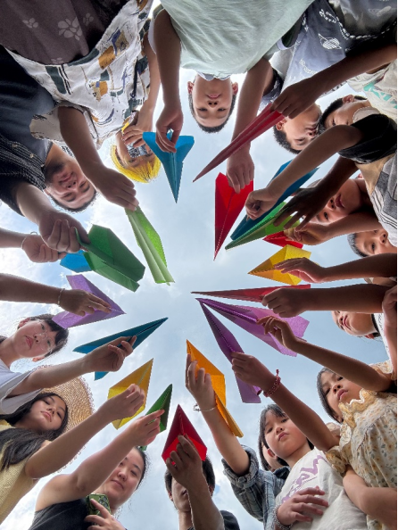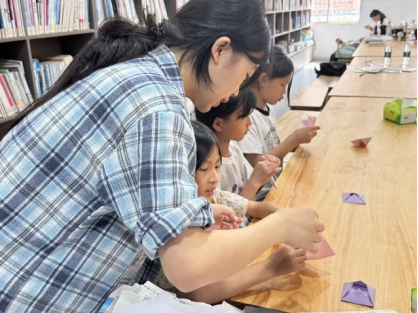 活动筹备阶段,志愿者结合儿童兴趣与认知特点,结合美育教育需求,多次打磨方案,精心设计折纸教程。课堂上,一群孩子围拢,手中彩纸翻转。志愿队小老师耐心示范,折痕交错间,纸飞机、千纸鹤渐现雏形。当彩色纸飞机在户外 “起飞”,孩子们欢呼,这是他们用双手赋予纸张的翅膀,载着想象飞向远方。