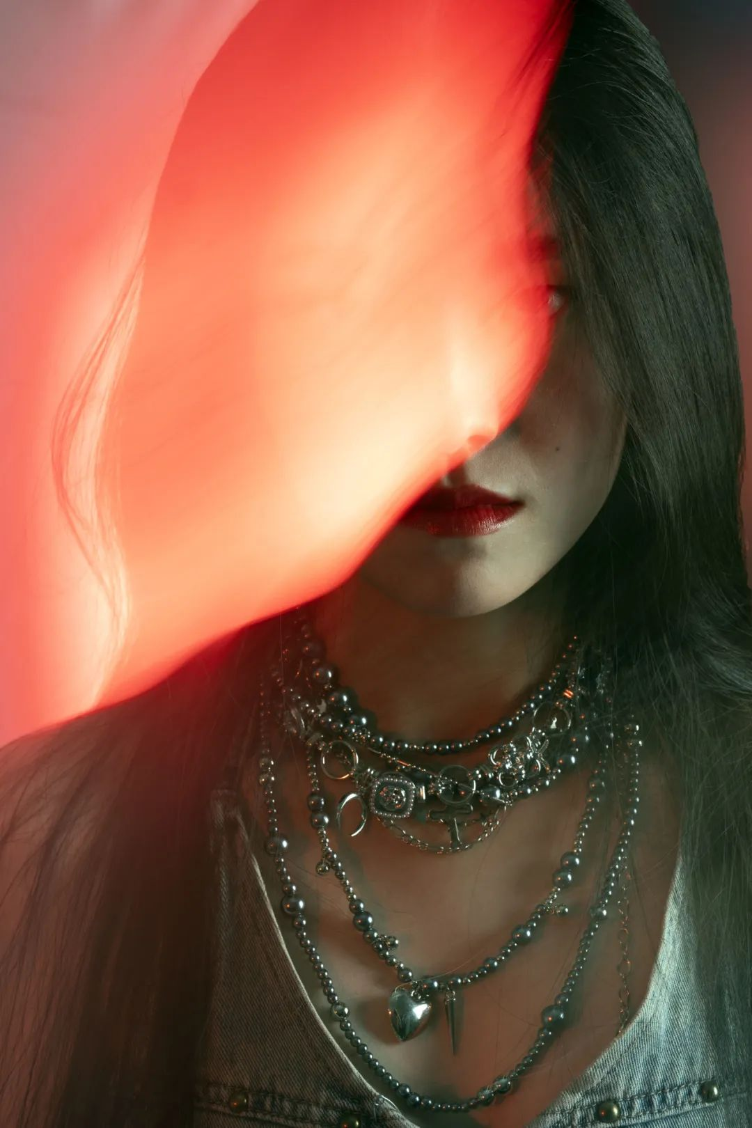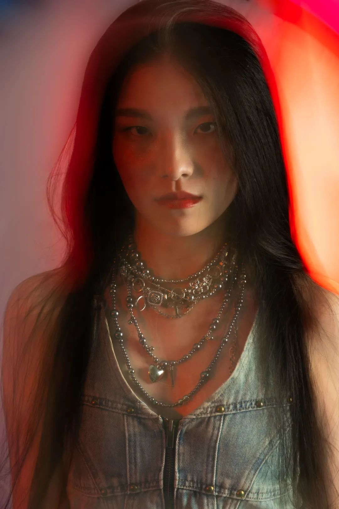 员工吴家怡作品以“美式复古”为核心概念。在服装选择上,牛仔挂脖上衣带着复古牛仔的硬朗基因,又以独特剪裁展现先锋结构;内搭白色缩褶小衫,用柔和形态与褶皱细节,增添层次与复古温柔感。下装的不对称裙装,是用牛仔裤重新剪裁成的裙子,打破常规裙摆形态,做旧质感呼应复古。配饰上,多层叠戴银饰项链,混搭不同链条、坠饰,营造随性又精致的朋克复古氛围,大尺寸格纹购物袋,既是造型亮点,也强化了复古街头感。造型色彩搭配围绕蓝色背景展开,服装以牛仔蓝、大地棕为主,红色光线作为情绪点缀,构建出冲突又和谐的视觉场域,传递出复古时代记忆与当代先锋精神碰撞融合的风格,展现个体在经典与潮流间的独特审美探索。