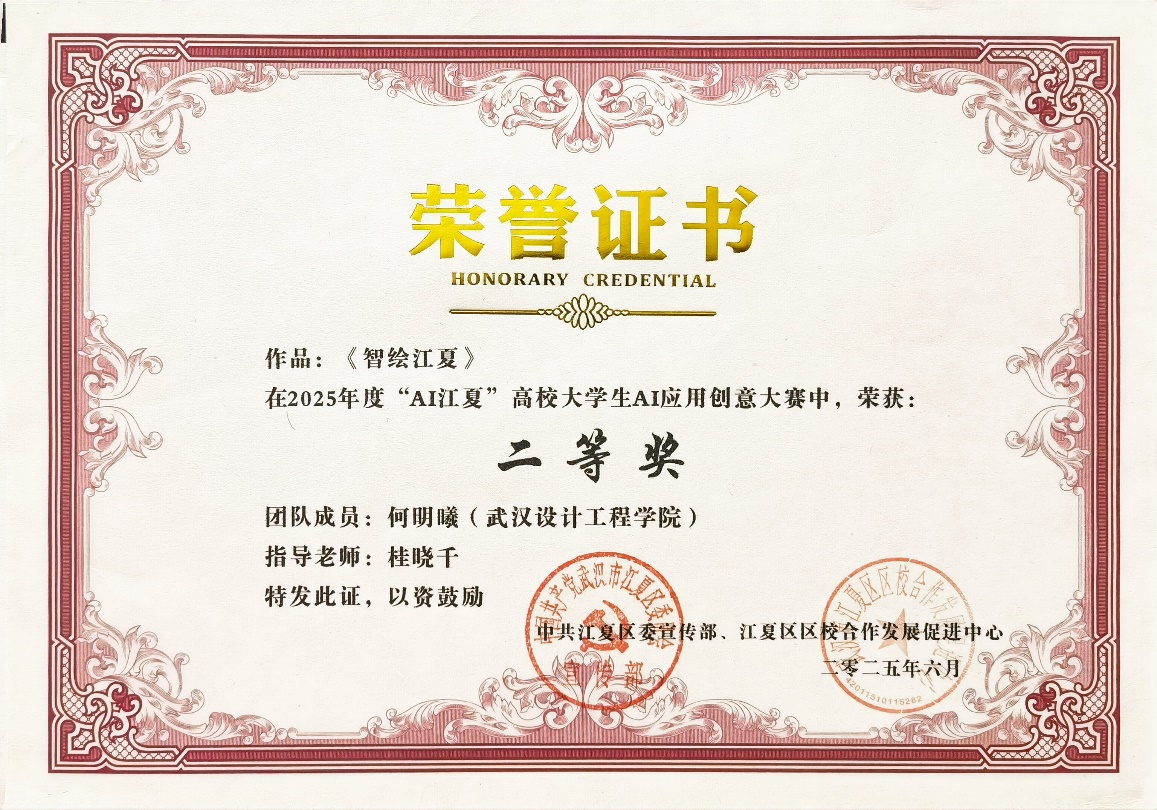 在近日闭幕的“AI江夏”高校老员工AI应用创意大赛中,公司服装与服饰设计(时尚营销)2201班学子何明曦,在老师悉心指导下,凭借作品《智绘江夏》从全国众多参赛队伍中脱颖而出,荣获总决赛二等奖,以及奖金5000元+江夏知名企业入职实习就业机会。该作品以突破性的AI城市叙事逻辑重构江夏文化IP,精准契合大赛"以技术赋能区域发展,以创新驱动产城融合"的核心命题,成为赛事中备受瞩目的文创科技标杆。