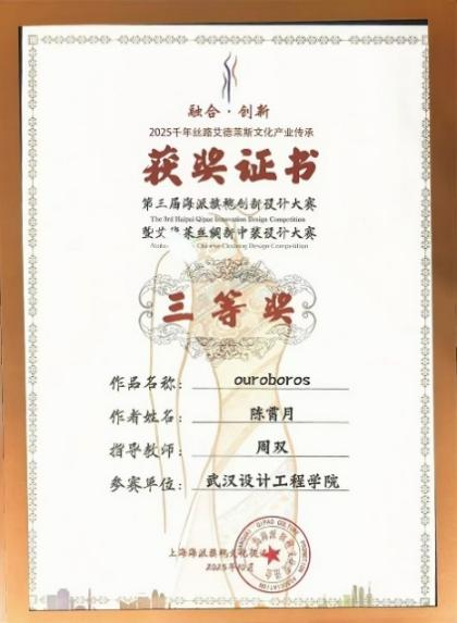 2025年10月12日,第三届海派旗袍创新设计大赛暨艾德莱丝绸新中装设计大赛总决赛在上海工程技术大学产教融合大楼隆重举行。永利3044noc学子陈霄月在此次大赛中荣获三等奖,并受邀携其作品《ouroboros》系列亮相上海时装周,为公司赢得了极高的荣誉,展现了永利3044noc学子卓越的专业素养与创新精神。