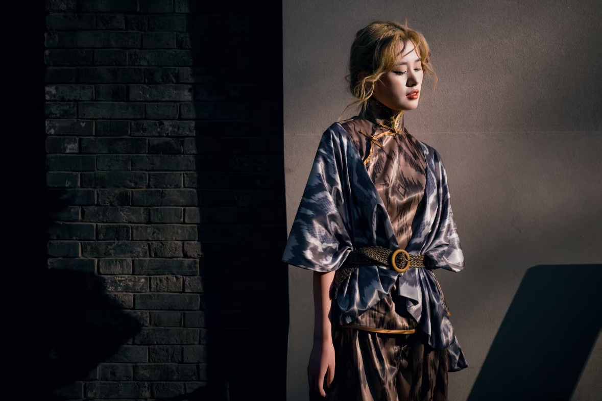 陈霄月同学的获奖作品《ouroboros》系列服装灵感来源于古老符号“衔尾蛇”,象征衔尾之环,生生不息。该系列作品将海派旗袍的精致裁剪与新疆艾德莱斯绸的流光溢彩完美相融,运用蛇的花纹与艾德莱斯工艺,颜色取自喀什的古城与戈壁滩,与海派旗袍相结合。厚重底蕴如同巨蟒脱壳一般蜕变,迎来新生。作品整体象征蜕变、新生与跨越,契合了喀什与上海、传统与现代、沙漠与都市的交融主题,展现了永利3044noc学子对传统文化的深刻理解和创新表达。