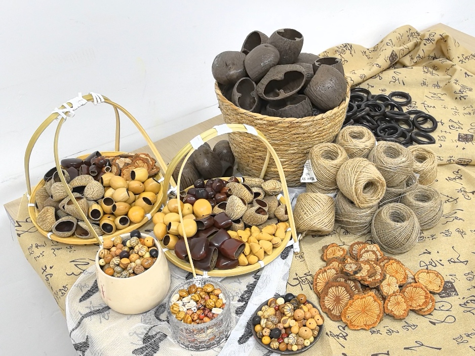 活动现场铺满了各式“自然宝藏”:带着龟裂纹理的印尼果、形似小铃铛的夹竹桃果、纹理如花朵的血藤片;棕红透亮的平安豆、圆润质朴的凤凰果、带着古朴气息的花豆蔻;还有禅意满满的菩提珠、质感独特的水玲铜……这些来自森林与山野的果壳,被分类摆放,每一件都藏着自然造物的巧思,瞬间勾起了同学们的探索欲。