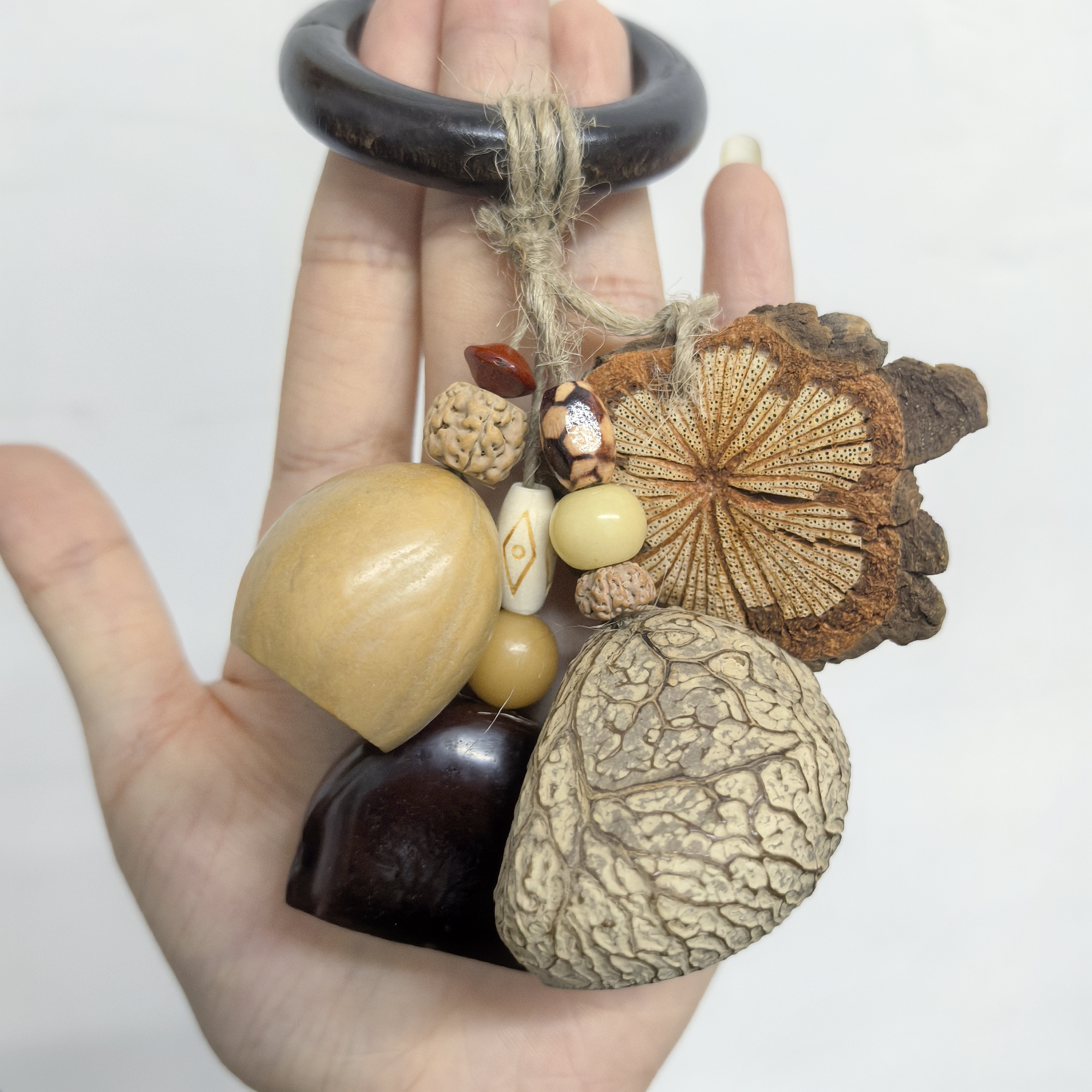 当同学们涌入现场,面对琳琅满目的材料,便一个个化身为“自然设计师”:有人偏爱印尼果的粗糙纹理,将它与血藤片搭配,让厚重与轻薄的质感碰撞;有人钟情菩提珠的禅意,串起一串带着佛系气息的摇铃;还有人脑洞大开,把水玲铜与夹竹桃果组合,期待它摇出“雨铃叮咚”的脆响……挑选、串连、创意摆放,大家的手指在果壳间穿梭,让这些原本散落的自然零件,在麻绳的牵引下有了全新的生命。