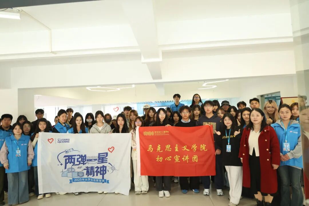 在创意设计分享环节,同学们手持自己设计的文化衫,热情分享创作理念。宣讲团队结合作品逐一点评总结:“大家的设计精准诠释了‘两弹一星’精神在当代的落地——从科研工作者的自力更生、艰苦奋斗,到核能技术对特殊群体的精准关怀,这正是红色精神在当下的生动实践。”