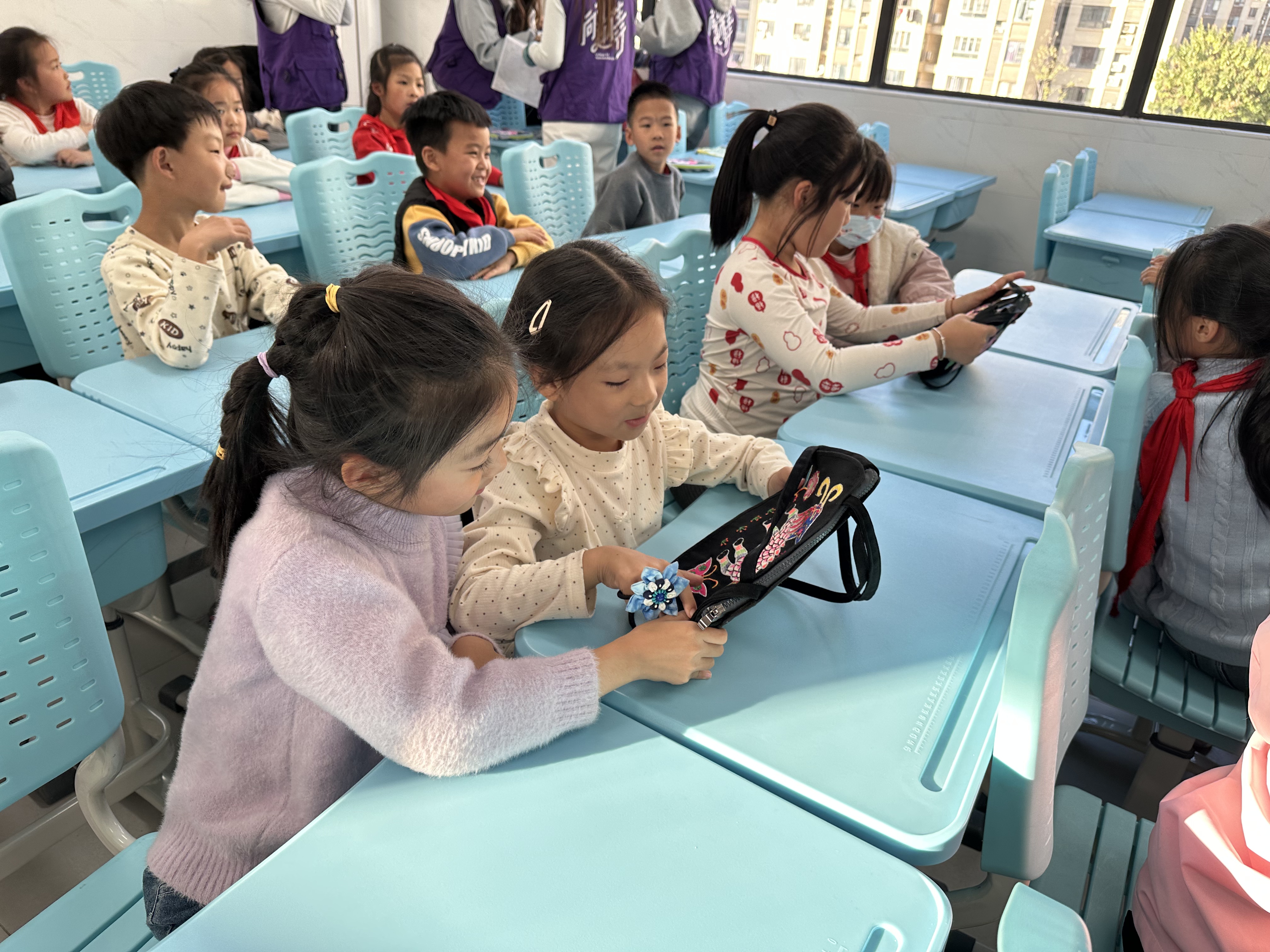 课堂伊始,永利3044noc胡舒娟老师展示的阳新布贴手工包,极大地吸引了小朋友们的兴趣,以此引入课程主题,将阳新布贴的起源故事、制作流程娓娓道来。