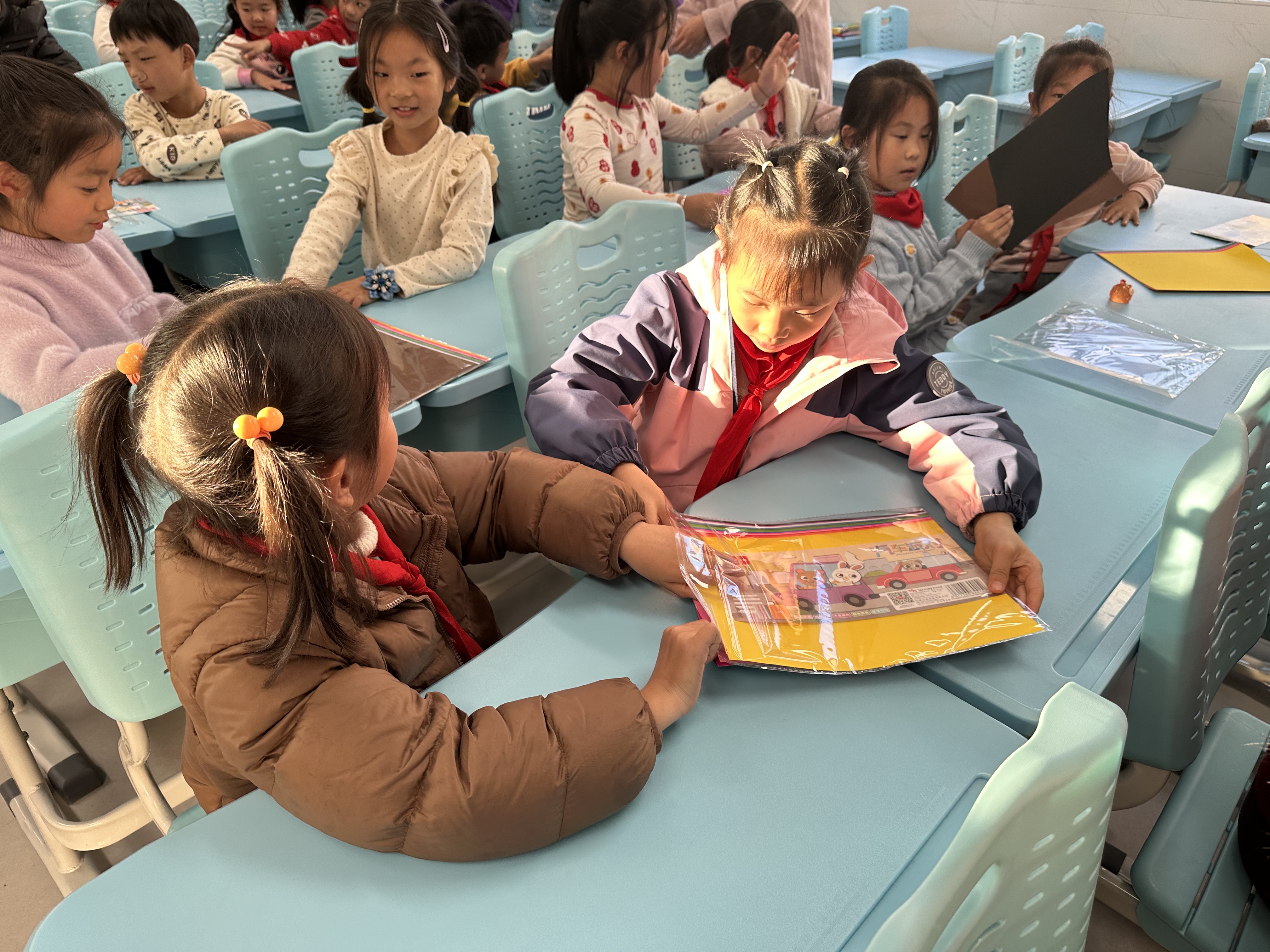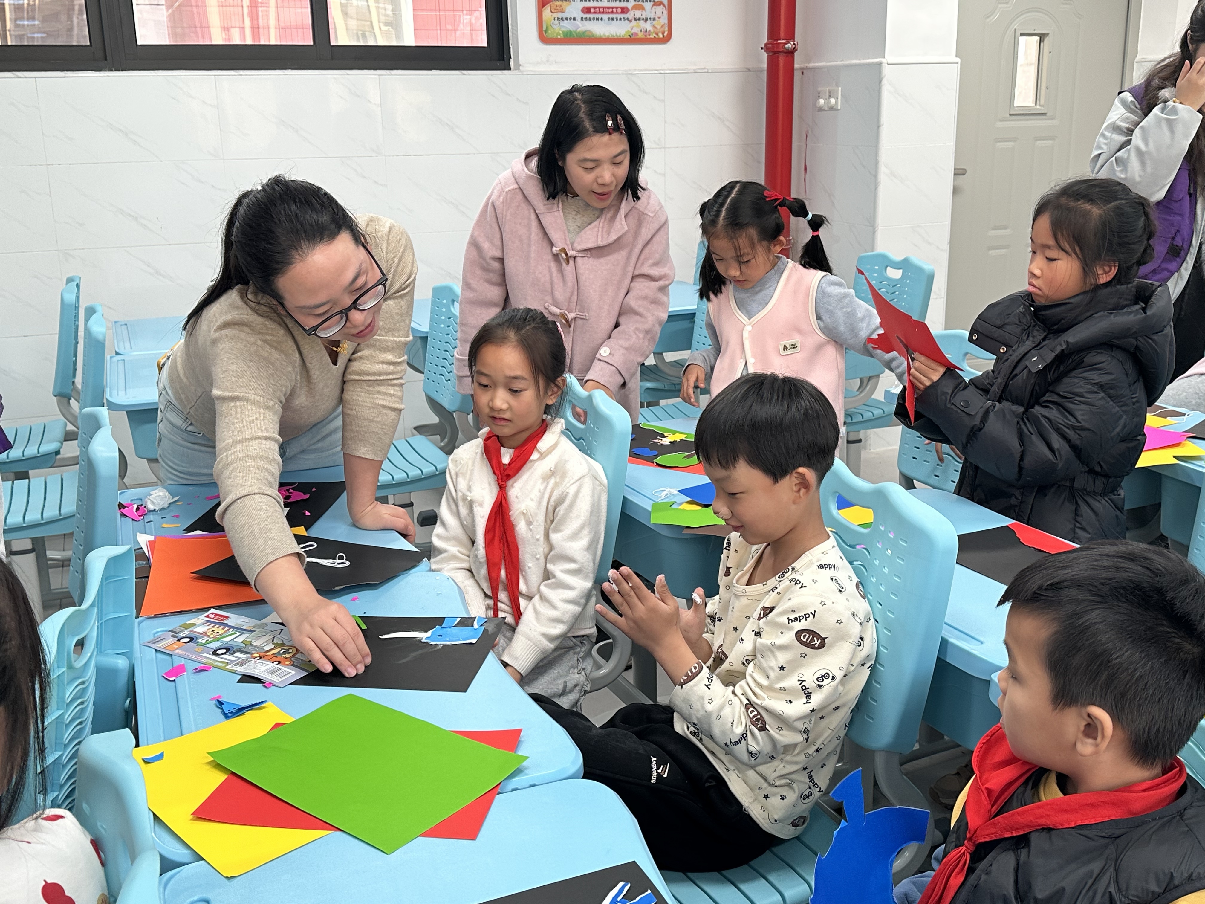 原本略显生疏的孩子们,在志愿者哥哥姐姐们的指导下逐渐熟悉,有的专注地裁剪着彩纸,准备制作一朵向日葵;有的和同桌讨论着如何搭配颜色,还原出动画片里的卡通形象;还有的发挥想象力,将不同颜色的彩纸手撕成不规则的小块,组合成独特的图案,脸上洋溢着专注与期待。