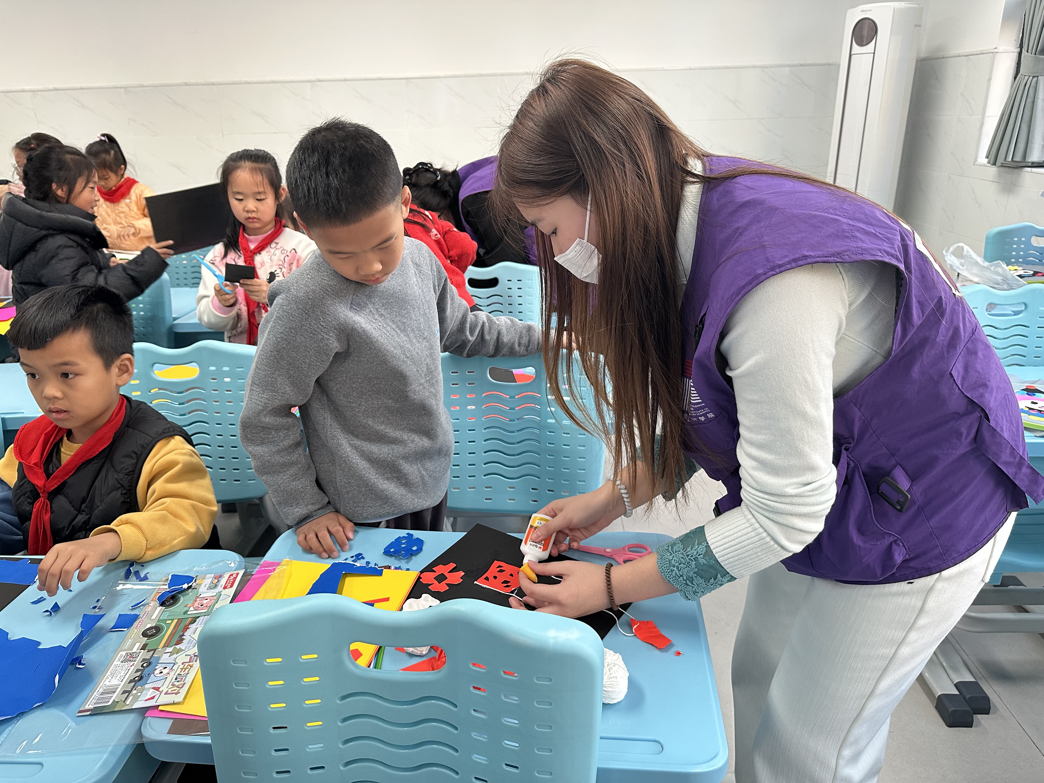 在实践操作环节,老师让同学们任意发挥自己的想象,用彩纸裁剪拼贴出他们想要的图案。接着,师生志愿者们分组走到孩子们身边,手把手指导创作。从选择彩纸颜色,到用铅笔勾勒简单的图案,再到小心翼翼地裁剪、粘贴,志愿者们耐心解答每一个疑问,也鼓励孩子们大胆创作。