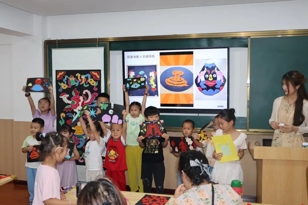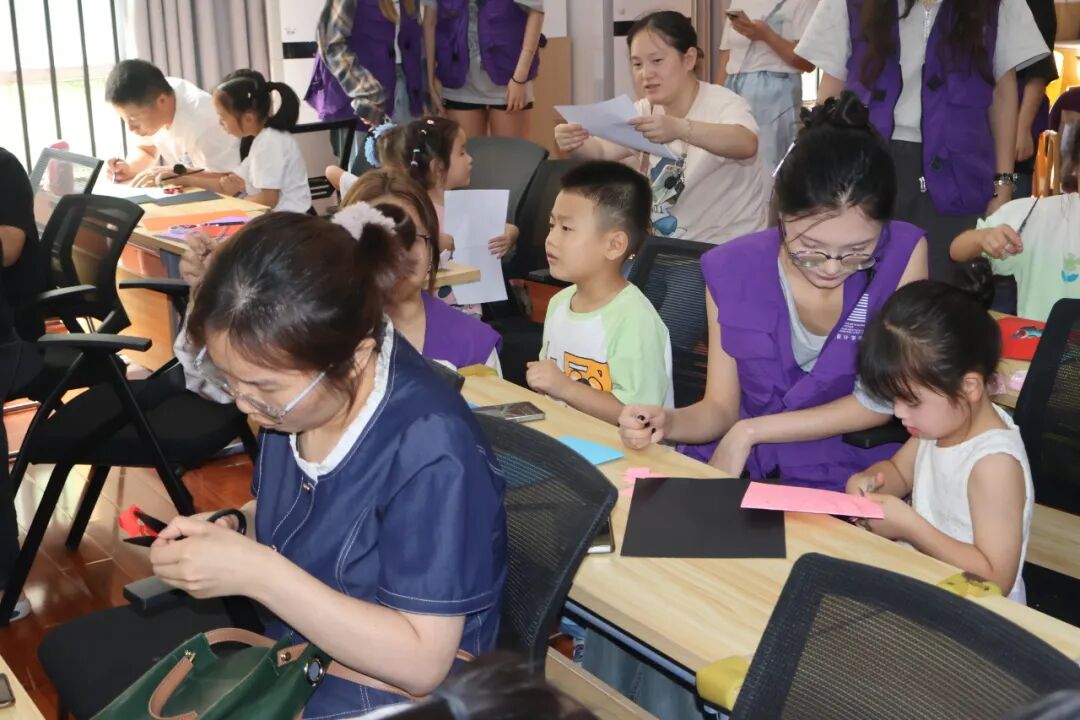 手工实操环节成为活动高潮。主办方准备了黑色卡纸、彩色宣纸、剪刀等工具,以剪纸拼贴形式还原阳新布贴艺术特色。在志愿者的指导鼓励下,孩子们手握剪刀剪出蝴蝶、小蛇等图案,拼贴粘于黑色卡纸上,作品稚趣盎然,与展出原作遥相呼应。不少家长参与其中,共创 “亲子合作款”,让文化传承从 “被动观看” 变为 “主动创造”。